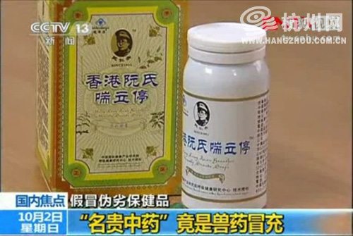 杭网记者根据这位网友提供的图片和央视报道的内容可以看出,被宣传为名贵中药的“香港阮氏喘立停”竟是兽药冒充,而批准文号国食健字G20090119对应的产品名称为“龙泽源牌参杞胶囊”并非“香港阮氏喘立停,网上销售的“天龙公司”生产的“香港阮氏喘立停”系假冒伪劣产品。