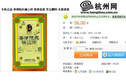 杭网记者在百度收索一下,关于香港阮氏喘立停系假冒伪劣的新闻不少于上百条,很多城市已经停止销售,而在某知名网站上仍然公开销售。希望杭州的网友注意识别,千万不要上当受骗。