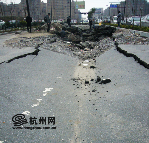 杭州网记者核实报道:按照网友提供的线索,记者找到了塌陷的地方,位于九堡客运中心站东面的胜稼路。