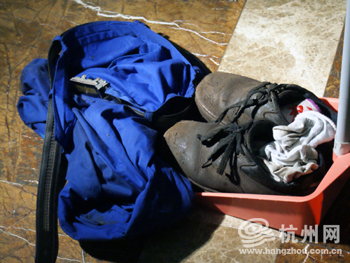 在急诊室,工作人员于阿姨正在清理男子送来时用过的病床,旁边的垃圾桶里还堆放着男子换下的工作服和鞋子。