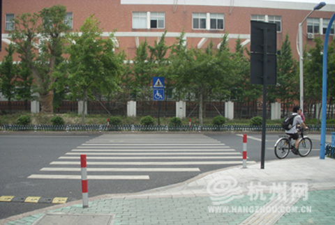 “这样的斑马线堪称‘史上最牛的斑马线’。”潘小姐说,这段让人困惑的马路位于福雷德广场西南角,属于下沙高教园区学林街的一段。今年年初,她看到有施工人员将学林街进行了路面和人行道的全面翻新。路面新铺了柏油,并画上了新的人行横道线,同时,在其两侧竖起了人行横道标牌和残疾人通行标牌。