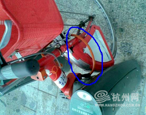 网友“wh46340411”在论坛上发帖:本周一早上,他赶着上班,在公共自行车租赁点看到一辆车子还在,于是兴冲冲地飞奔过去。“就近一看,我当场傻了……”网友特地将自己所看到的一幕拍了照。