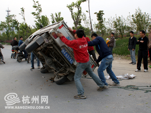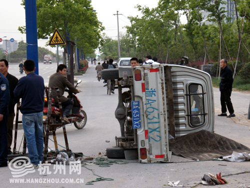 据杭网记者进一步了解,侧翻车为五菱小货车,是王先生平常拉玻璃用车。车子右侧门窗玻璃破碎,右前轮破裂,车前面的保险杠也被撞烂。到18点20分左右,附近围观的群众合力把侧翻的小货车扶正。