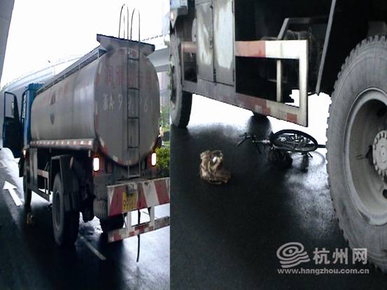 “那个女的推着自行车在斑马线上走,那辆车突然撞了过来,我反应都来不及。”郑先生说,被撞倒的是一个看上去40多岁的中年女子,被撞倒后,中年女子随即被油罐车拖行了几米。