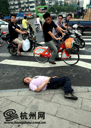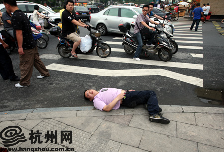 一位目击的老大妈说,她看到男人最初是坐在马路边的,当时他在打电话,声音很大,她只是好奇,这男人怎么就坐在地上打电话。后来他去超市出来时,他已经不省人事了。