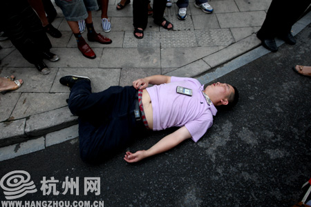 杭网记者核实报道:胖男人就平躺在秋涛北路华润超市的附近的路口,衣服穿的很整洁,粉色T桖,蓝色裤子,锃亮的黑皮鞋黑牛皮腰带,胸前还放了个不错的手机。杭网记者赶紧凑近试图把男人扶起来,才发现男人酒气特别重,路上下班的人很多,但并没有围观的人。附近值班的协警说,他也是刚在杭网记者到来之后才注意到的。现场给我们爆料的小刘说,她还以为,是有人在搞行为艺术,恶搞路人的,小刘说,辽宁卫视有个“新笑林',专门恶搞路人的,所以她不敢靠近胖男人,所以不知道男人喝醉了,后来忍不住,才给杭网打电话爆料的。小刘说从她看见的时间算起,醉酒男人应该躺了有20分钟了。