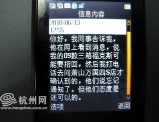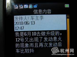 杭州网记者把了解的情况也反馈给了投诉的车主,并让他们放心,没想到第二天就有车主李小姐给杭网记者发来短信说:“自己的车6月10号去萧山4S店做了系统升级,12号又出现发动熄火的现象。”这让她很担心,平时在网上看到过一些报道,但是福特公司的人已经说了升级后可以解决问题,也就放心了,现在升级后又出现熄火现象,自己已经不敢相信了。