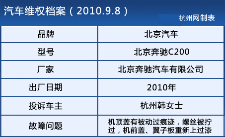 杭州韩女士花了近40万,买了奔驰C200,却发现机顶盖有被动过痕迹,螺丝被拧过,机前盖、翼子板重新上过漆,韩女士怀疑是被撞的事故车,因为新车不可能被动过。