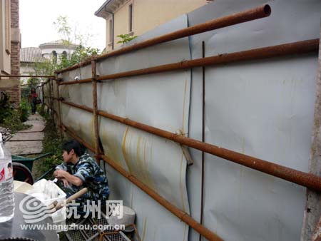 施工队在外面建起了护栏阻止执法队员进入,执法队员告诉记者,擅自建护栏本身就是违章。