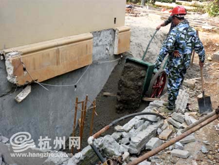 记者在现场看到,室外的违章地下室是沿着别墅主体房挖建的,深约3米,现场负责回填的工人告诉我们整个面积大约有60平方,目前施工已经进入浇筑钢精混凝土工序。工人们采用的方法是用土方将已经挖好的“坑”进行回填,恢复室外建筑的原来样子。