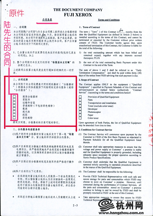 “富士施乐公司提供给法院的合同复印件,我看到有改动过的地方,在法庭上我让富士施乐公司出示原件,富士施乐公司代理律师以没带为由拒绝出示。”杭网记者发现两个合同确实不一样。