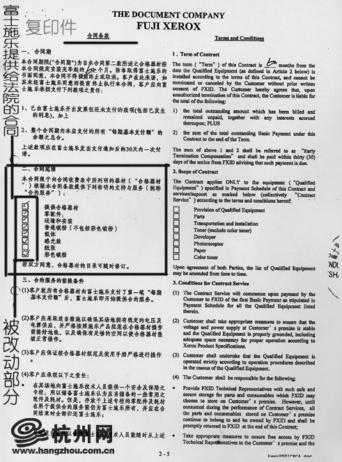 北京康文伟义陆先生告诉杭网记者,公司和富士施乐公司的纠纷目前已经在上海浦东新区法院开庭了,对于其他的自己并不想多说,等待法院的判决。陆有两点让他有疑问的地方,他给杭网记者出示了一份疑似被富士施乐公司更改过的合同,陆先生同样是2002年和富士施乐公司签订了《按张收费销售合同》,也同样因为机器质量问题和富士施乐公司产生纠纷,富士施乐公司又把康文伟义的陆先生告上法庭,在上海浦东法院庭审时,陆先生就拿出了自己的一份合同,这份合同和富士施乐公司的合同有着明显的不同,同一份合同怎么会不同呢?陆先生怀疑富士施乐公司把合同内容给改了。