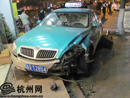杭州网记者核实:据现场目击者说,开奔驰的是个小伙子,20多岁,当时是由东向西行驶,和湖墅南路上由北向南行驶的出租车相撞。出租车又撞上了路边的告示牌,冲上了人行道,在一家“丝路花雨”花店门口停下。