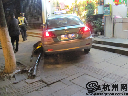 要不是先撞上这个指示牌,估计出租车要冲进花店了。