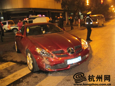 12月22日,杭州网热线85052222接到网友朱先生爆料,昨天晚上11点半左右,湖墅南路和米市巷交叉口发生一起车祸,一辆红色的奔驰跑车和出租车撞上了。