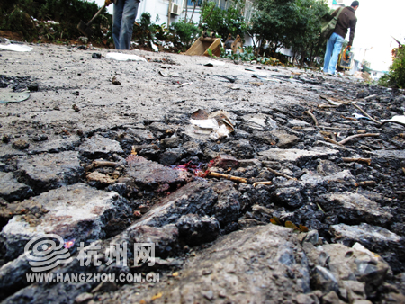 事发现场,坑坑洼洼的路面上还留有老太太的血迹。