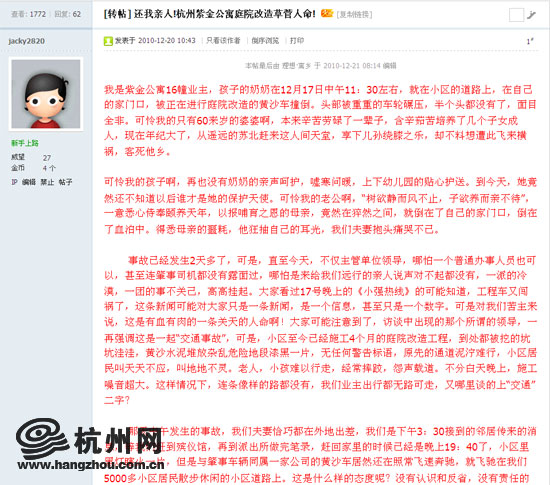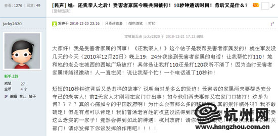 20日,即事故发生后的第三天,网友“jacky2820”在杭州网论坛上接连发帖,讲述了这起车祸的后续情况,引起了近万名网友的关注。