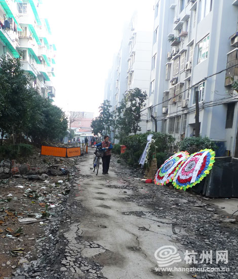 11幢的住户周大伯正出门去买菜,他推开单元门后习惯性地撩了撩裤脚管,踮起脚拣稍微平整一些的路面走过去。他告诉我们,小区内的施工确实带来过许多不便,现在又死了人,这让他们觉得很担心。“经常有老人、小孩子跌倒的,没有一块平地,垃圾又乱堆乱放,太脏了!”