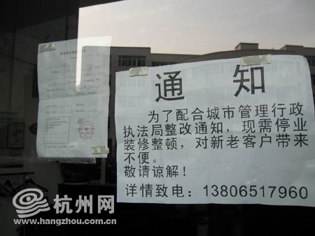 该店确处于关门停业状态,店内无人,店家在玻璃窗处由内向外张贴着一份《接受调查处理通知书》和一张内容为“为了配合城市管理行政执法局整改通知,现需停业装修整顿,对新老客户带来不便敬请谅解!详情致电:***”的通知。电话拨打该电话,得到所留电话已停机。