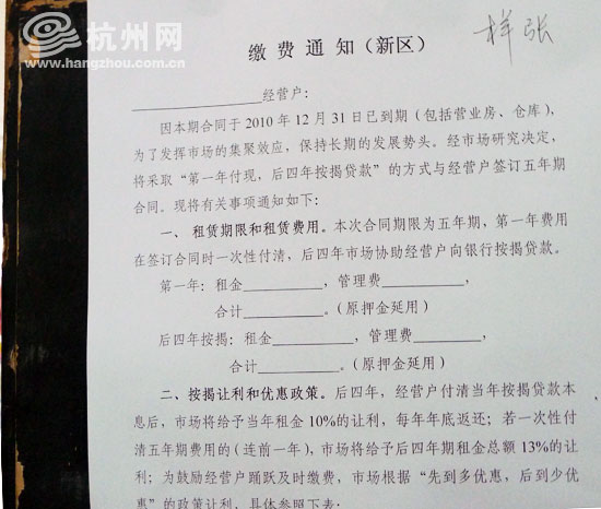 告示内容显示,因市场与商户之间的合同已于2010年底到期,包括营业房和仓库都需要进行续签。于是市场提出方案,要和大家一次性签五年合同,方式是“第一年付现,后四年按揭贷款”,并且配备相关的按揭让利和优惠政策。通知上还写明:“缴费的截止时间为2011年1月26日,逾期视作自动放弃,市场将不再与其续签合同。”