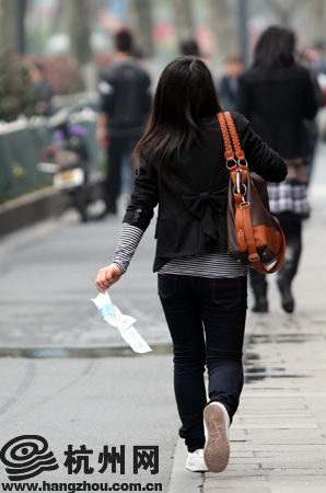 体育场路一吃冷饮的女孩将果皮带了约七八十米扔进垃圾箱