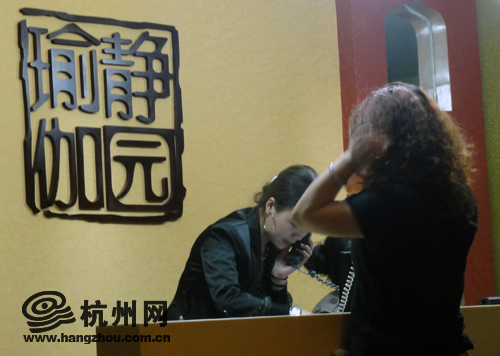 瑜伽馆的两位工作人员在好负责人联系汇报处理情况
