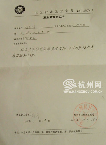 随后,记者咨询了上城区卫生局卫生监督所的唐水林,他告诉记者:“虽然他们这两家店符合卫生许可相关条件,但是受限于《杭州市服务行业环境管理办法》中的“禁止在3层以上的居民楼内开设新设产生油烟、恶臭、噪声污染、振动污染的服务项目’的制约,所以未取得餐饮服务许可证。但是现在杭州很少有3层以下的房子了,所以这样的规定可能有些欠考虑到餐饮服务从业者。我们也在想办法提出更完善的规定,既能保障住宅楼居民的环境,又能使餐饮从业者能找到合法的经营场所。”