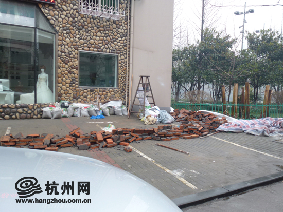 根据叶青苑稻香园5幢的居民所述,这家名叫“杭州简爱摄影机构”的婚庆公司从2011年11月底开始装修,最近开门营业。在其装修的3个月期间,该店占用了门口的公共人行道,并筑起一道低矮的围墙,装修材料直接堆放在围墙内。