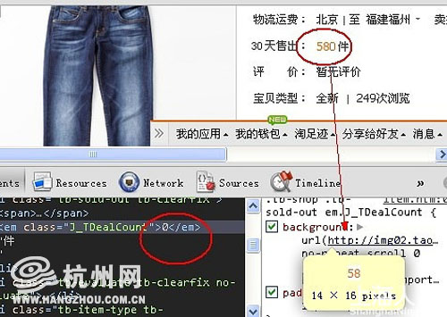 从左下角的html中可以看出,实际的销售数量是0,但是右下角店铺利用css把0右移一点,左边空出的地方用了一个背景图58构成了580件的销售量。(图片来自互联网)