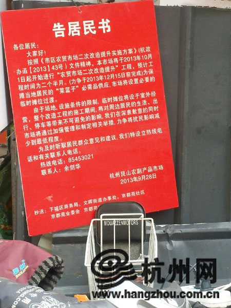 在临时菜场门口,记者看到一块醒目的“告居民书”。根据这块告示,这个临时的农贸市场原是附近的艮山农副产品市场,因为要进行“农贸市场二次改造提升”工程,在这里设立的临时过渡摊位。