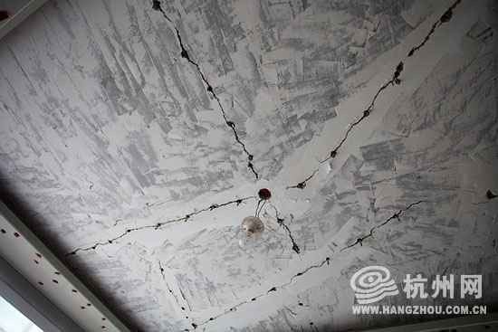 走进13幢1单元的一户正在装修的人家,抬头一看,5条明显的裂痕发射状布满整块天花板,就像蜘蛛网一样。问问装修师傅有没看到过这样的房子,装修师傅头摇得像波浪鼓一样。