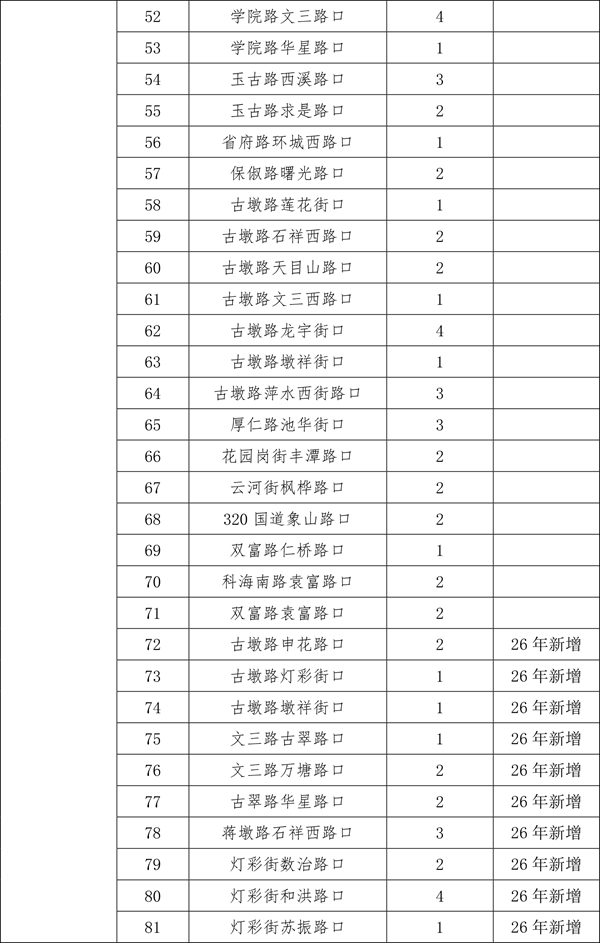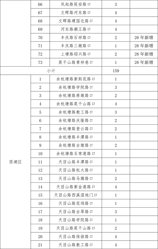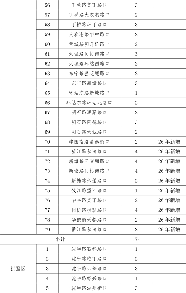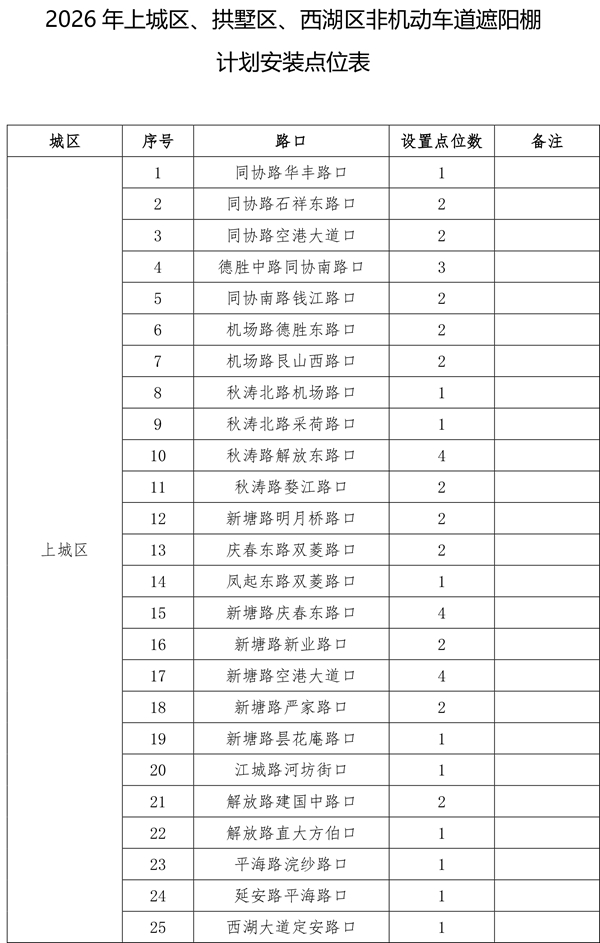 | 随着天气渐暖,2026年非机动车道遮阳棚的设置工作已然启动。为保障今年夏季遮阳棚设置到位,更贴合市民群众遮阳避雨的需求,杭州城管部门提前谋划,计划今年在上城区、拱墅区和西湖区共设置500个遮阳棚。 由于2025年安装的470个遮阳棚中,部分点位存在树荫遮挡等情况,经排摸,计划取消其中的26个。另有今年新增(调整)的点位共计56个。现将500个确认安装的点位进行公示,在此基础上,如市民朋友还有设置需求和意见建议,可于3月30日前发送电子邮件至hz85175529@163.com。点位设置要满足路口无树木遮荫、非机动车通行量较大、通行宽度大于3米、不影响地下管线和智慧交通探头、机非道路有隔离带、无道路施工、地铁建设等前置条件。 后续,城管部门将根据市民意见、建议,结合道路施工、地铁建设等因素,对点位进行优化调整,经审定后确认实施。其他区、县(市)根据属地情况自行实施安装。