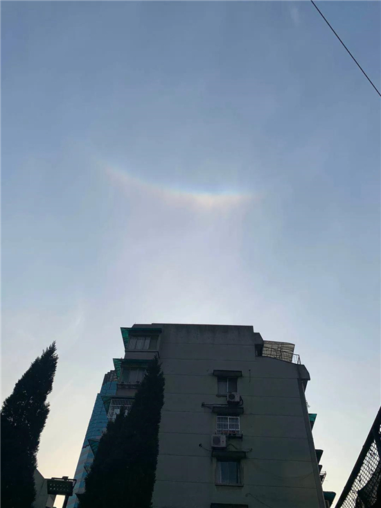 记者 殷佩琴 摄 不过,杭州气象台跟记者确认,这并不是彩虹,而是日华。日华,是大气的一种光学现象。在天空出现的半透明薄云里面,有许多飘浮在空中的六角形柱状冰晶体,偶尔它们会整整齐齐地垂直排列在空中。当太阳光射在这一根根六角形冰柱上,就会发生非常规的折射现象。 你注意看的话会发现,日华的颜色刚好跟彩虹相反,内部是蓝绿色外部为红色。如果外边一圈是白色的,就是日晕,是光透过卷层云产生的,这时可能就要下雨了。 也有读者疑惑地问,这看起来更像“环天顶弧”。气象观测是按生成原理区分的,弧的话有很多种,要看云和太阳的相对位置,环天顶弧是日华的一种。 |