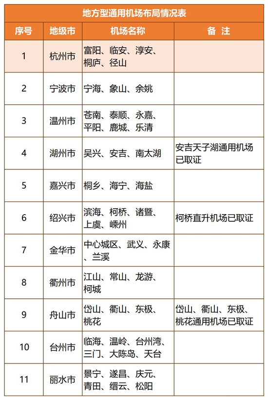 若干A3级通用机场 按需布局建设若干用于自然灾害救援、紧急事件处置、城市消防、警务飞行、低空旅游、工农林作业等用途的A3级通用机场(含直升机起降点),由地方政府申报并纳入浙江省通用机场布局规划体系,争取达到平均每千平方公里1个以上(全省约100个以上)。 可登录省发改委网站(http://fzggw.zj.gov.cn/)查看《浙江省通用机场布局规划(2020—2035年)(修编)》完整文件。 |