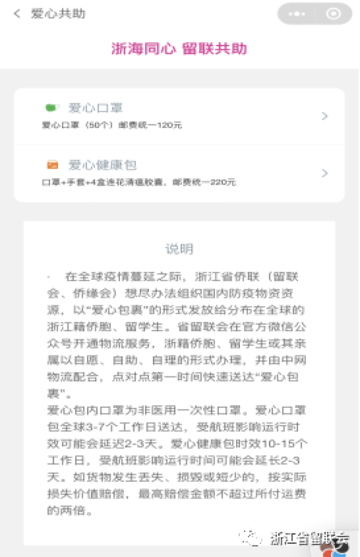 ● 领取须知● 由于爱心“健康包”数目有限!目前发放对象只面向在海外留学的浙籍留学生,每位留学生限领一份。建议大家发扬互帮互助的精神,优先满足急需防护物资同学的需求。 请各位登记内容时一定要做到准确填写资料,帮助我们以最高的效率发放物资。 01 爱心健康包都包含什么? 我们将提供两种爱心包套餐组合,由留学生和家长自行选择,物资均由省侨联统一采购,免费提供。 套餐一:爱心口罩(50个非医用口罩) 0.5KG以内 邮费统一120元 物流时效:速度快,全球3-7个工作日送达 (受航班影响,运行时效可能会延迟2-3天) 套餐二:爱心健康包(口罩+手套+4盒连花清瘟胶囊) 1KG以内 邮费统一220元。 物流时效:中转时间较长,航班时效10-15个工作日 (受航班影响,运行时间可能会延长2-3天) (以上仅供参考,一切以实物为准) 02 领取步骤 ●①关注浙江省留联会微信公众号●