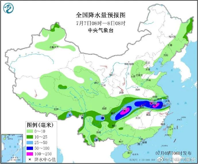 中央气象台7月5日10时继续发布 暴雨黄色预警 据中国气象局统计,6月,全国气象部门通过各种渠道累计发布各类气象灾害预警信息4.3万余条。 其中,暴雨、雷电的预警信息发布数量均比过去三年同期增加了43%左右。 据应急管理部,截至7月3日,今年以来洪涝灾害先后造成贵州、四川等26省(区、市)1938万人次受灾,121人死亡失踪,直接经济损失416.4亿元。 中央气象台7月5日10时发布暴雨黄色预警: 预计,7月5日14时至6日14时,上海、江苏南部、浙江北部、安徽中南部、江西东北部、湖北东部和南部、湖南北部、重庆东南部、贵州北部、云南西北部以及山东半岛北部、黑龙江西北部、吉林北部等地部分地区有大到暴雨,其中,安徽南部、湖北东部和南部、湖南西北部、浙江西北部等地部分地区有大暴雨(100~230毫米)。上述部分地区伴有短时强降水(最大小时降雨量40~60毫米,局地可超过70毫米),局地有雷暴大风等强对流天气。
