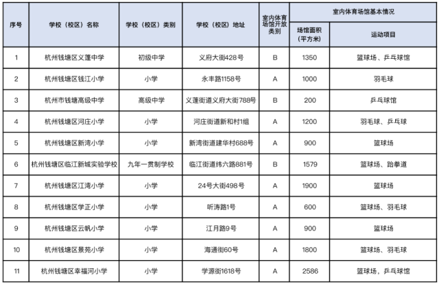 备注 A类:无住校生的小学、无住校生和晚自修的中学,开放时间为工作日每天3-4小时,双休日、节假日、寒暑假期间每天8小时; B类:有住校生的小学、有住校生、有晚自修的中学,开放时间为双休日、节假日、寒暑假期间每天8小时。 室内运动场所根据实际情况,只开放义蓬中学和钱江小学两个。(室内运动场馆均委托第三方管理,室内运动场馆健身器材有偿使用) 预约方式 钱塘各校现已开放的所有室外体育场所和室内体育场馆,均可采用刷脸或刷卡方式进入,市民可持身份证或市民卡在学校公告的开放时间段进入校园运动。 |