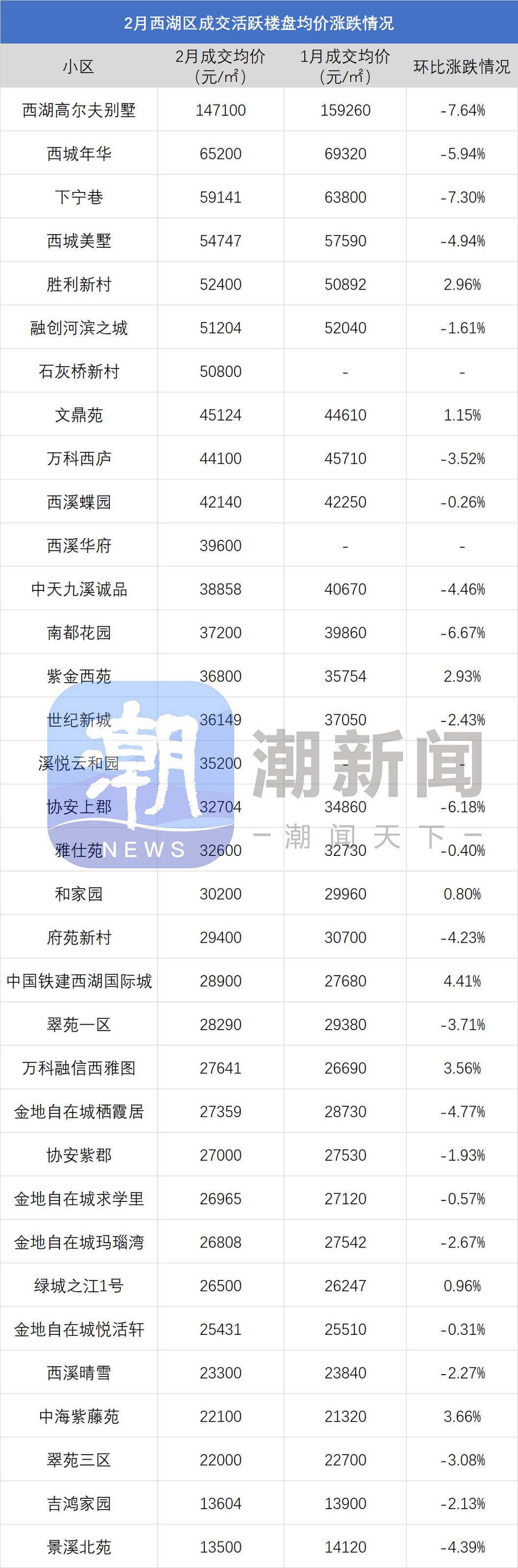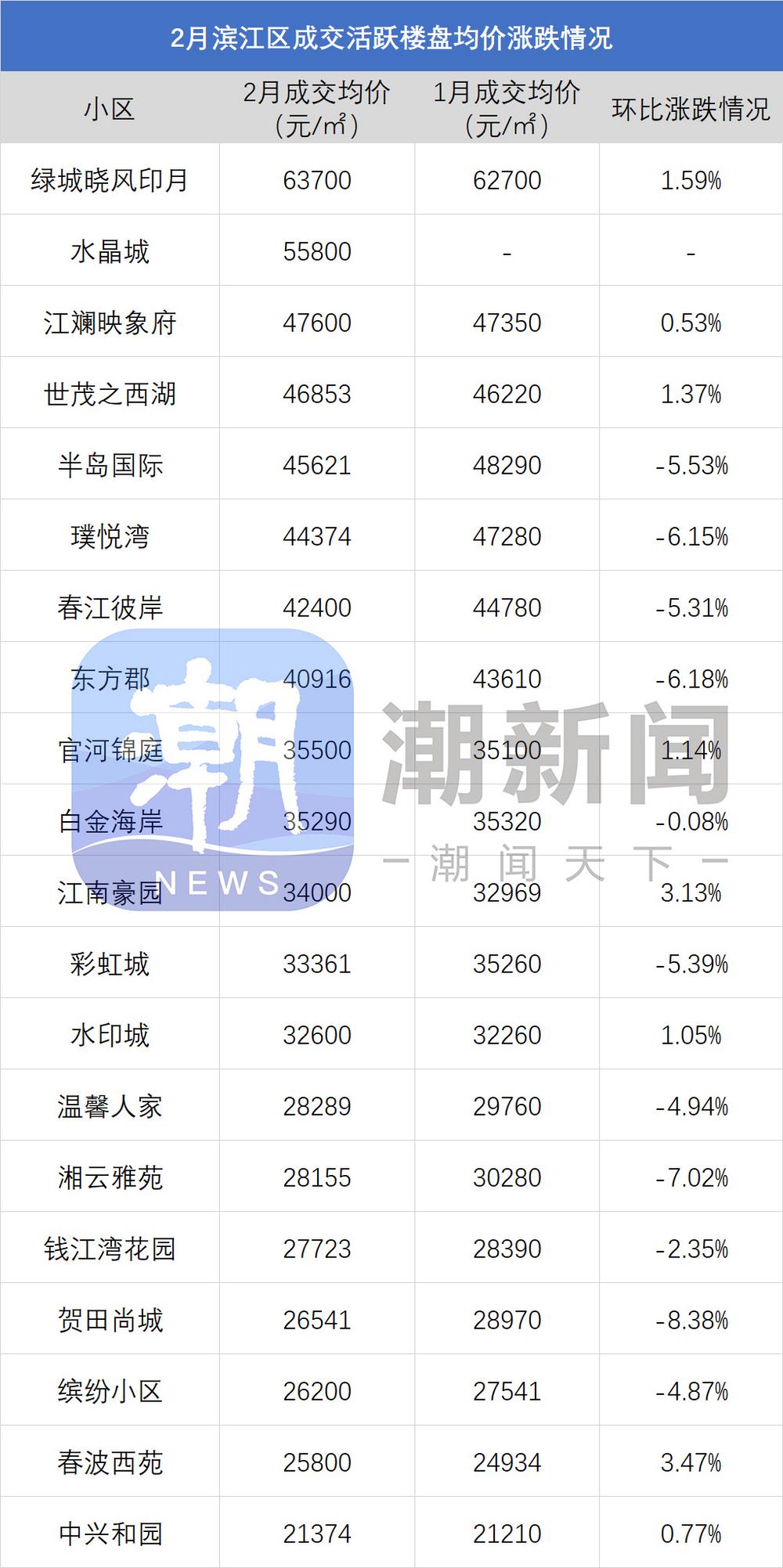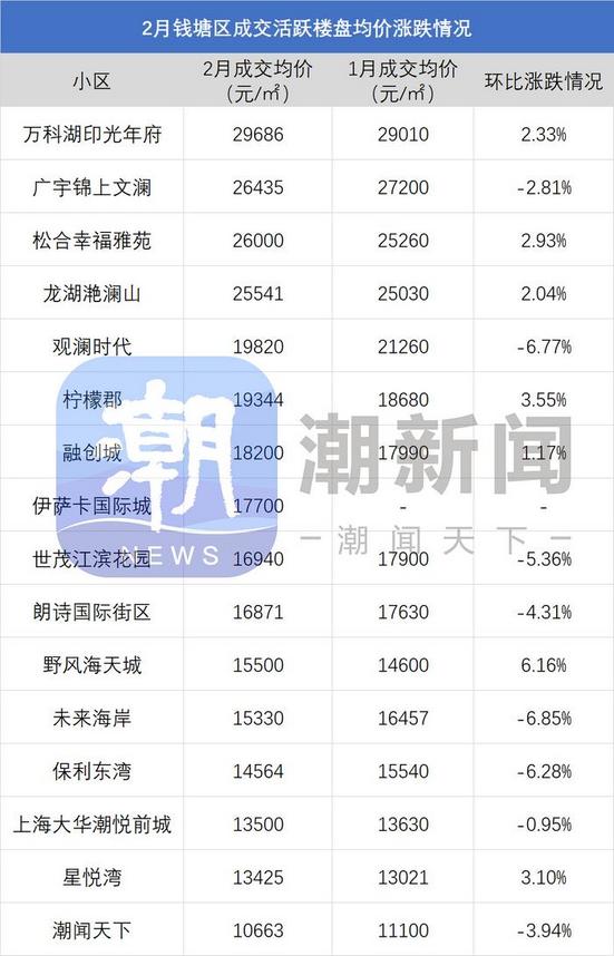 注:一、以上数据来源于中指研究院,统计为2026年2月二手房成交均价,2026年1月二手房成交均价;二、在不同成交时期,成交的物业类型(别墅、排屋、公寓等)、精装与否、户型大小、楼层与楼幢位置的不同会造成价格变动;三、有些房源为了减少税费,会稍微压低成交单价;而有些二手房为了增加银行贷款,也有可能稍微做高单价,具体房源信息建议去实地看看。 2月成交仍以刚需盘为主 均价止跌反弹 杭州我爱我家数据显示,2月杭州全市二手住宅成交均价为28944元/㎡,相较上月(27011元/㎡)环比上涨7.2%。这是自去年3月以来,二手房价格首次出现如此明显幅度的止跌反弹。 从成交结构来看,总价300万元以下的房源成交占比高达71.8%,同比提升近10个百分点。其中,200万元以下“老破小”及远郊性价比房源占比达49.2%。低总价房源凭借跌出来的性价比,让二手市场成交保持了持续的流动性。 杭州贝壳研究院数据显示,杭州2月网签量TOP20小区中,有接近四分之三的小区,网签均价在3万元/㎡以内;有过半的小区,网签均价在1字头。杭州2月网签量TOP5小区中,除了越秀星汇城之外,其余四盘均来自余杭区闲林、未来科技城一带,分别为:新明半岛、西溪海、桃源小镇、闲湖城。 据潮新闻美好生活研究院统计梳理,除了西溪海2月均价环比下降了6%之外,新明半岛、桃源小镇、闲湖城2月成交均价已基本稳定,环比涨跌幅度在1%上下。而余杭区二手房的常年月度销冠——翡翠城,2月成交均价27916元/㎡,环比大幅上涨了8.69%。 市中心老小区、远郊小区 价格逐步回正 涨跌榜数据显示,2026年2月,拱墅区、临平区,涨价小区数量已经超过了降价小区。上城区、钱塘区,涨价小区数量与降价小区数量近乎持平。 具体来看,拱墅区主要是一些市中心超跌老小区的价格回正,以及申花、文晖部分改善小区的成交发力。比如,大塘新村,2月成交均价21600元/㎡,环比上涨了3.16%;十五家园,2月成交均价26670元/㎡,环比上涨了4.18%;德胜新村,2月成交均价19754元/㎡,环比上涨了5.97%。申花板块,则主要靠馥香园、庆樾上府的成交发力。 临平区,涨价小区数量是降价小区数量的2倍左右。星桥、临平新城、临平北、崇贤等板块,部分交付时间在10年以上的小区,价格回正甚至上涨。比如,临平良熟区块的御华府,2月成交均价14300元/㎡,环比上涨了8.66%;崇贤的锦昌年华,2月成交均价15241元/㎡,环比上涨8.63%。 钱塘区,与临平区情况相似,都是一些交付多年、超跌的小区的价格,在逐步回正。 上城区,涨价楼盘则主要集中在钱二。潮映万象轩、留香园、江月望云、天澜海岸,2月成交环比均有上涨。其中,涨幅最多的小区是御品湾,2月成交均价41200元/㎡,环比上涨了9.6%。 |