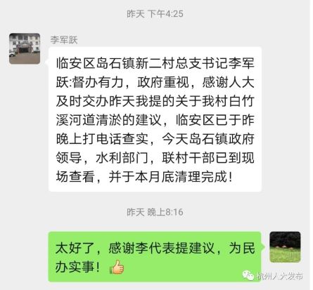 三农工作群的联络员将这个问题提交给了杭州市疫情防控指挥部。当天晚上,李军跃就接到了反馈电话;3月3日,岛石镇水利工作负责人、联村干部就组织到现场进行查看,并明确在4月15日前完成河道清淤工作。 于是,就有了开头李军跃发在群里的那句话。 市人大代表、淳安县农业农村局农经管理总站的陈芬辉反映的有关农产品大量滞销,部分经营主体短期流动资金周转困难,村集体经济损失较大,建议有关部门给予关注和支持的建议,也被指挥部采纳。 每天,各条战线上的人大代表们除继续在奋战在疫情防控和复工复产一线外,还会把在工作中、生活中了解到的、想到的问题和建议推送到人大代表专业群。截至3月4日,共有73名代表提出了问题和意见建议173条。 高效能 人大搭台、代表唱戏、政府落实! 点赞智慧人大建设的“新载体” “人大搭台、代表唱戏、政府落实。建立专业代表微信交流群,既能发挥代表专业优势,为疫情防控和复工复产集思广益、建言献策;又能深入组织代表在闭会期间有效开展活动,精准履职发力。”市人大常委会有关负责人说,市人大代表专业微信群正是依托杭州智慧人大建设,发挥微信实时交流、广泛互动优势搭建的高效平台。 智慧人大建设是人大工作适应数字经济时代的迫切需要,是服务杭州城市治理现代化的有效载体,也是推动人大高质量履职的必然要求。此次疫情防控工作中,市人大机关严格执行重大情况报告、值班备勤、信息报送等制度,充分运用“智慧人大”办公系统以及“杭州人大云平台”“钉钉”的信息化手段,有效组织预防管控、志愿服务等工作。 “疫情之后,如何依托智慧人大建设,进一步发挥各级人大代表的作用,进而更加有效推动人大制度在杭州的生动实践,值得我们进一步思考和探索。”市人大常委会有关负责人表示。 |