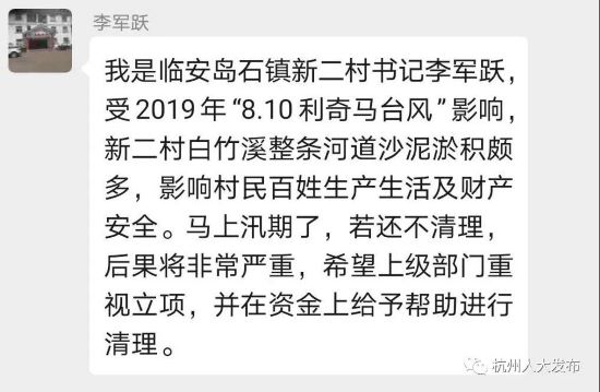 从3月1日开始,包括李军跃在内的291名市人大代表,根据各自岗位、行业的不同特点,陆续被邀请进入生产经营、三农工作、教科文卫、基层工作、法律工作5个专业代表交流群,每个微信群配备一名联络员,由市人大常委会机关和相关专(工)委工作人员担任。 这些人大代表工作、生活在一线,对各地疫情防控和企业生产经营情况比较熟悉,对党委政府相关决策部署、法律法规实施情况比较了解。人大代表会在群里提出问题和意见建议,联络员当天进行收集汇总,并形成书面材料发送至市疫情防控指挥部,指挥部回复和落实情况也会及时推送至微信群,形成了意见提出-办理-反馈的高效互动闭环模式。 闭环办 有问题群里说 代表们的意见建议有回音 去年下半年,“利奇马”袭击了李军跃所在的新二村,原本一直忙着灾后重建的他打算趁着过年休息一下,可是因为新冠肺炎来了,他又毫不犹豫冲到了防疫最前线。这40多天里,李军跃每天都和村里的干部群众一起,宣传防疫知识,走访农户,做好疫情防控工作。 3月2日,李军跃照常在村里巡查疫情防控的情况,一路到白竹溪附近,他发现河道有泥沙淤积的情况。他立马想到了“人大代表‘三农工作群’”。于是,他如实将这一情况反映到了微信群。