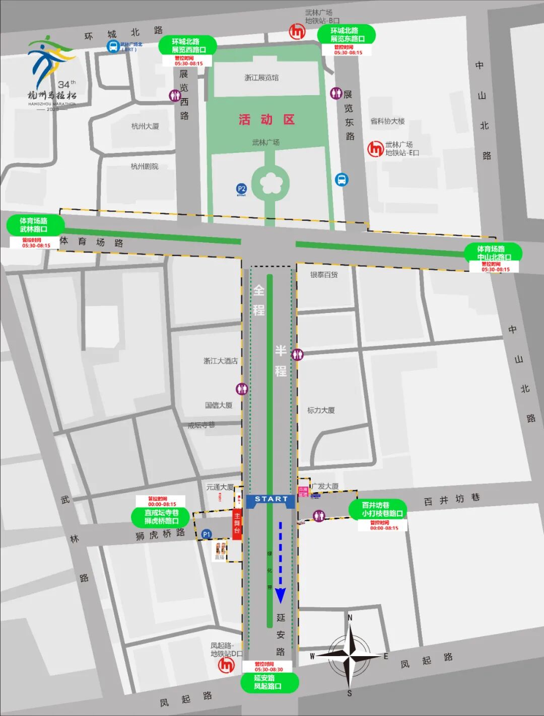 2020杭州马拉松比赛将于11月22日(本周日)举行。届时,将有1万名运动员分别参加全程马拉松、半程马拉松比赛。其中,全程马拉松、半程马拉松起点设置在下城区武林广场周边体育场路、延安路;全程马拉松比赛终点设在滨江区奥体中心内;半程马拉松终点设在江干区新业路口东侧江堤。 杭州马拉松赛线路 (一)全程马拉松:延安路、庆春路(过武林路口后进入南侧车道)、环城西路(西侧车道)、北山街、杨公堤、虎跑路、虎玉路、南复路、之江路、新业路口折返、之江路、飞云江路、钱江路、复兴大桥二层道路、时代大道辅道折返、闻涛路、机场城市大道路口西侧上江堤跑道、民祥路口下江堤、民祥路、观澜路、鸿宁路、鸿宁路观澜路口以南930米处折返、鸿宁路、观澜路、民和路、民和路观澜路口以南420米处折返、民和路、观澜路、闻涛路、奥体中心全程终点。 (二)半程马拉松:延安路、庆春路(过武林路口后进入南侧车道)、环城西路(西侧车道)、北山街、杨公堤、虎跑路、虎玉路、南复路、之江路、新业路口上江堤、半程终点。 交通管控图区示意图 ▼赛道分时分段实行交通管制,卡点及管控道路合围区域只出不进。 【7:00-9:00 【7:00-10:00】 【7:30-12:00】 【8:00-14:00】 【8:00-14:30】 绕行分流路线 【东西向】 1、原过境体育场路、凤起路、庆春路的车辆建议绕行: ①天城路-文晖路-文三路; ②艮山西路-环城北路-天目山路; ③庆春东路-庆春路-中河路-解放路; 2、原过境之江路、之江东路的车辆建议绕行: ④之江路-复兴路-秋涛路; ⑤之江东路-塘工局路-钱江路-望江路-秋涛路-复兴路; 【南北向】 3、原过境环城西路、延安路的车辆建议绕行: ⑥莫干山路、湖墅南路-潮王路-上塘路-中河高架; 4、原过境灵溪隧道往返滨江、城西的车辆建议绕行: ⑦紫之隧道-之江大桥; ⑧钱江四桥-中河高架-上塘高架-德胜快速路-文一路隧道; ⑨文二路-潮王路-上塘路-中河高架-钱江四桥。 |