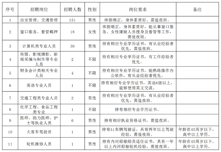 招聘条件 (一)具有中华人民共和国国籍,18周岁以上,35周岁以下; (二)拥护中华人民共和国宪法,遵守国家法律法规,品行端正; (三)户籍不限,面向全国; (四)具有大专以上文化程度; (五) 需具备正常履行岗位职责所需的身体条件和工作能力,有一定的文字功底、能熟练操作计算机。部分岗位需适应夜班,自愿从事警务辅助工作,且服从公安机关管理及安排; (六)同等条件下,优先招聘公安类或政法类院校毕业生,具有岗位所需专业资质或专门技能的人员,退役士兵,见义勇为积极分子和先进个人,以及在职公安民警的配偶、子女; (七)烈士、公安英模,因公牺牲和一至四级伤残民警,以及因工(公)死亡、一至四级伤残警务辅助人员的配偶、子女(无配偶子女的可为同胞兄弟姐妹),招聘条件可适当放宽。 (八) 具有轮机维护专业技能、车辆A1驾驶证人员,报考对应岗位的,所需年龄、学历可适当放宽。 报名时间及方式 报名时间:即日起至7月10日,上午8:30至11:30,下午14:00至17:00。 报名地点:富阳区鹿山街道依江路756号(杭州市公安局富阳区分局东门办事大厅)。 咨询电话:0571-63330033 现场报名当天需提供资格审查所需材料。资格审核不合格的,取消进入下一环节资格。 合同和待遇 聘用人员按照现行规定签订劳动合同,首期合同不低于5年。工资待遇实行层级化管理,缴纳“五险一金”。 |