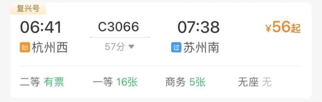 杭州西站前往苏州南站最低只需56元,比调整前优惠了7元。