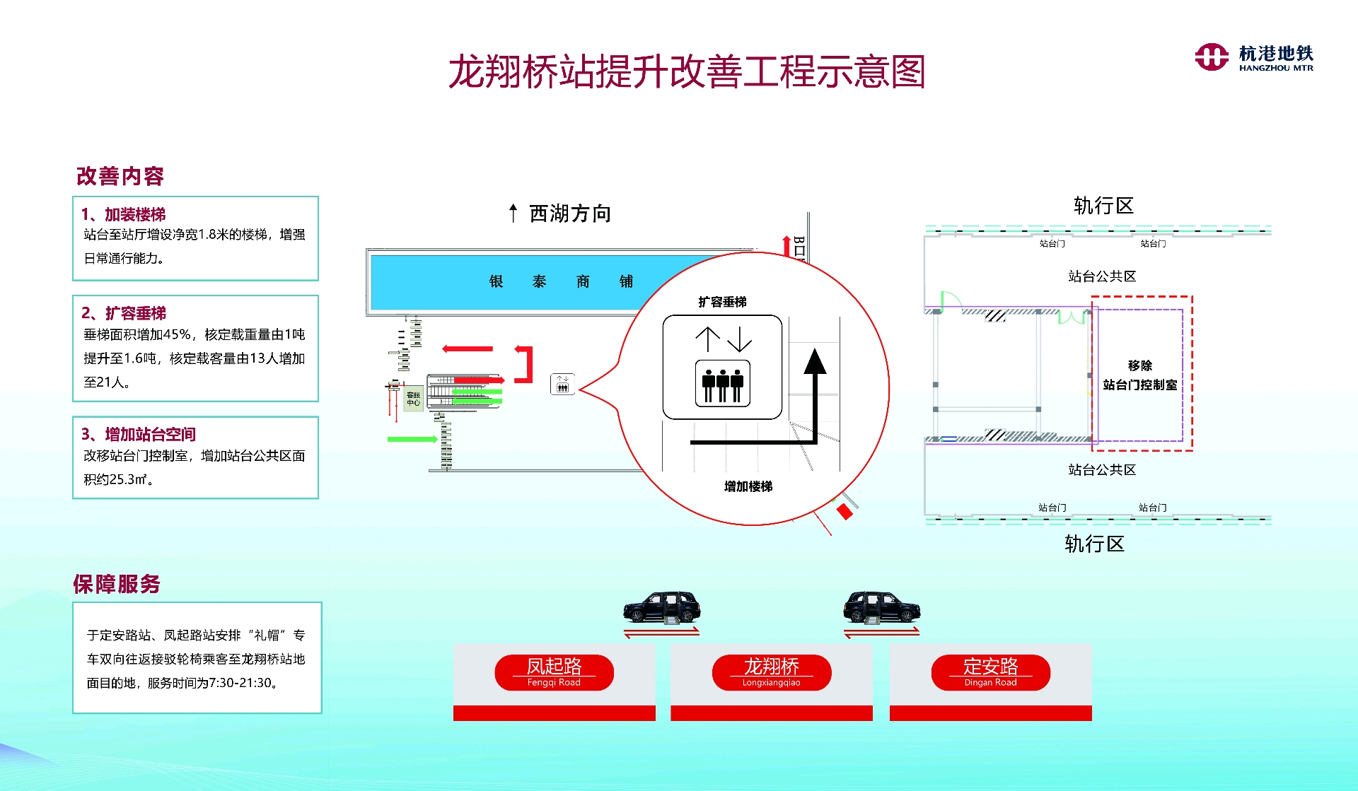 加装楼梯、扩容垂梯、增加站台空间 紧邻西湖景区的龙翔桥站,周末及节假日客流集中。站内空间有限且连接商场综合体。本次改善工程将结合客流动线特点及应急疏散,通过在站台至站厅增设净宽1.8米的楼梯,增强日常通行能力。 同时,改善工程还将对站厅内现有垂直电梯进行扩容,扩容后垂梯面积增加45%, 核定载重量由1吨提升至1.6吨,核定载客量由13人增加到21人。在增加乘梯人次的同时也提升了无障碍服务能力,为更多使用婴儿推车、轮椅及有需要的乘客带来便捷。 为提升乘客的站台候车体验,本次改善工程还将改移站台门控制室,增加站台公共区面积约25.3㎡。 无障碍出行温馨提醒 站内垂直电梯扩容改造期间将暂停使用,为保障轮椅乘客的出行需求,杭港地铁已于定安路站、凤起路站安排“礼帽”专车双向往返接驳乘客至龙翔桥站地面目的地,专车服务时间为7:30-21:30;轮椅乘客可联系车站工作人员获取帮助,也可提前拨打杭州地铁服务热线0571-96600或通过杭州地铁APP预约。 施工期间运营正常 本次提升改善工程预计2026年3月完成,施工期间龙翔桥站正常运营,乘客出行不受影响。杭港地铁会持续关注车站客流情况,调派额外的工作人员开展各类客流引导措施,发挥改善成效,保障乘客安全、高效出行。希望广大市民、游客能给予理解与支持,配合现场工作人员的引导,有序进出车站。前往西湖景区的乘客也可在地铁1号线定安路站、1/2号线凤起路站、7号线吴山广场站出站。 杭港地铁后续也将结合龙翔桥站实际情况,不断探索优化举措,提升车站通行效率。如乘客在搭乘地铁过程中需了解相关信息,可拨打杭州地铁服务热线0571-96600获取帮助。 |