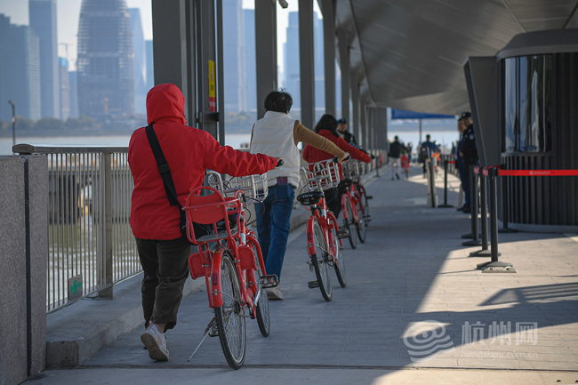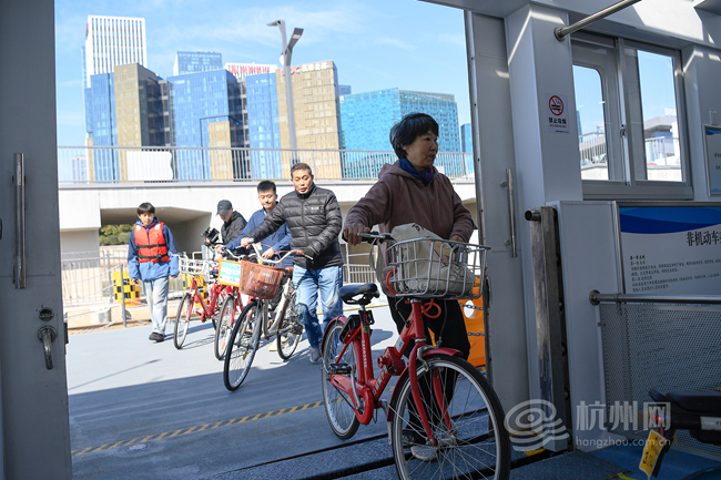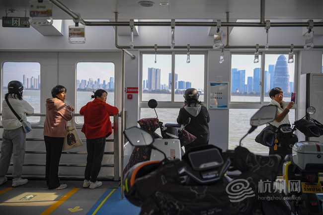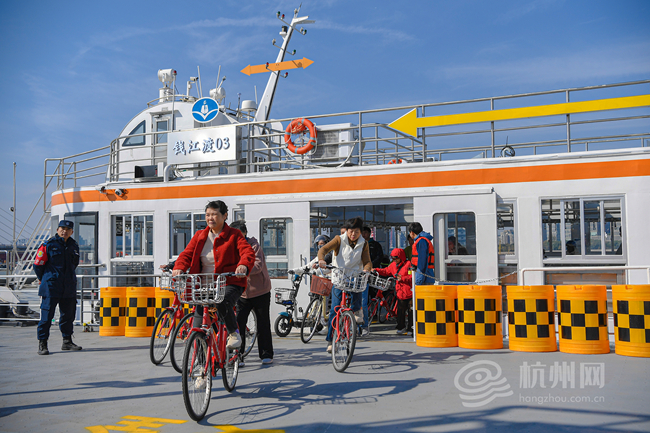 “体验感很好,小红车一扫就骑过来,快得很!”家住钱江路的黄阿姨赶上了高峰期的轮渡,同一班次的46名乘客里,既有像她这样的通勤族,也有特地来尝鲜的游客。
