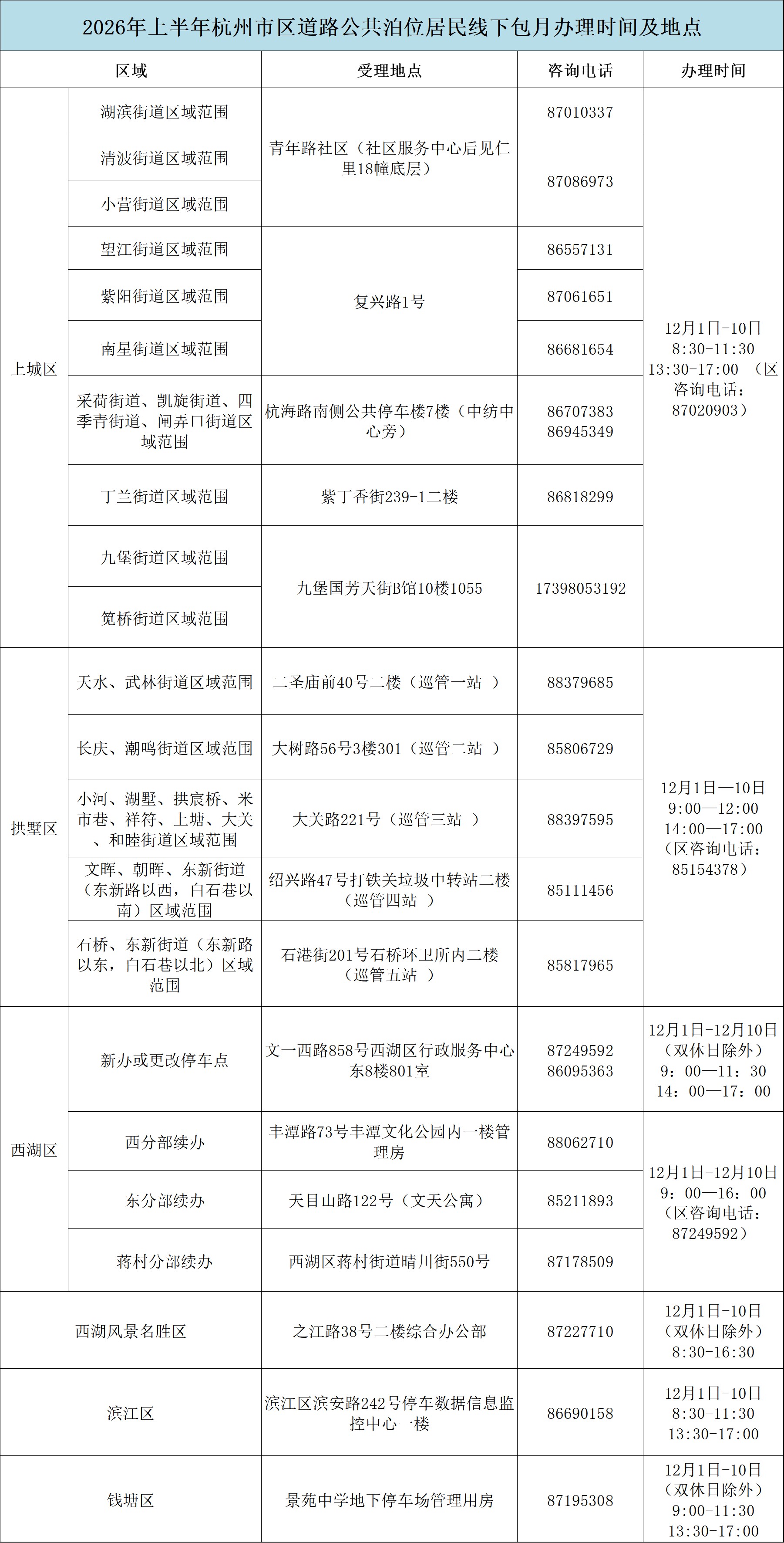 | 2026年上半年杭州市区道路泊位居民停车包月将于12月1日至10日集中办理,此次包月业务支持线上、线下同时办理,一起来看看具体有哪些要求。 包月范围 此次包月范围为上城区、拱墅区、西湖区、西湖风景名胜区、滨江区、钱塘区,共2.4万余个道路停车收费泊位。 包月对象 主要为道路泊位周边存在停车困难的住宅小区业主(使用人)。 包月申请材料 有道路停车包月需求的市民,请准备好车辆行驶证、户口本、房产证或租房合同等相关证明材料(三证统一优先),前往线下办理点或通过线上途径进行办理。 包月线下办理时间及地点