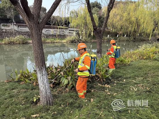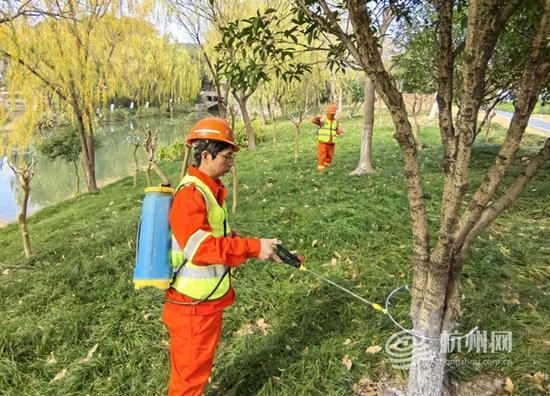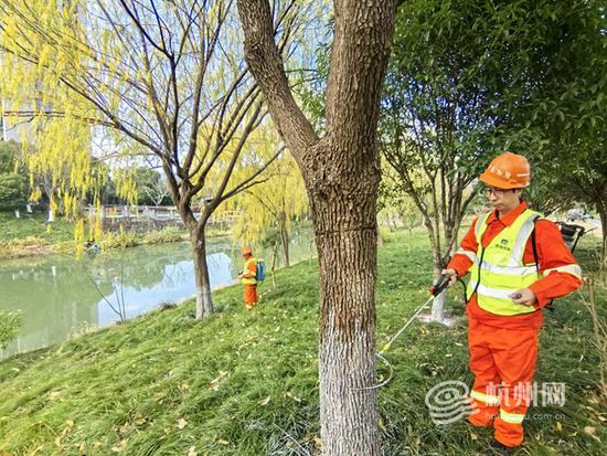 所以每年天气一转冷,备塘河养护工母贤福就会带着工具和刷白剂出门完成“刷白”工作。 母师傅的班组负责河道两岸长4.52公里的绿化区块,大概有3000多棵树,这项工作他已经做了7年了。跟往年不同,他这几天带的工具不是刷白桶和刷子,而是一个喷桶背包和圆环。