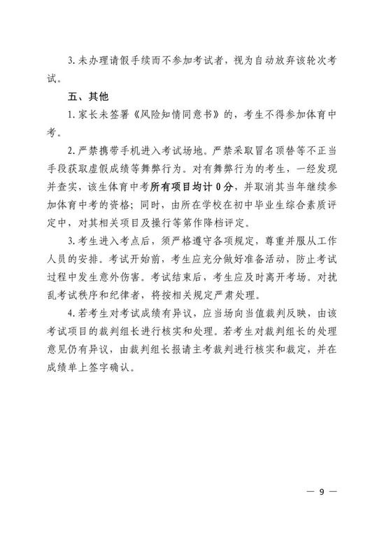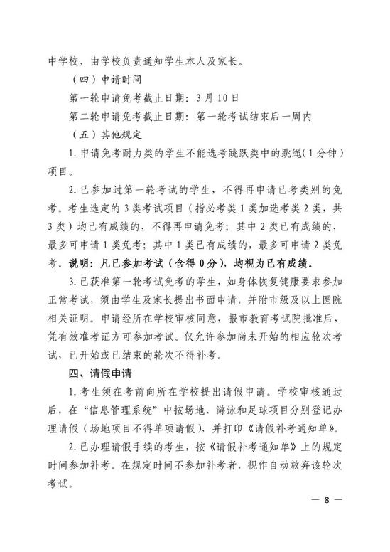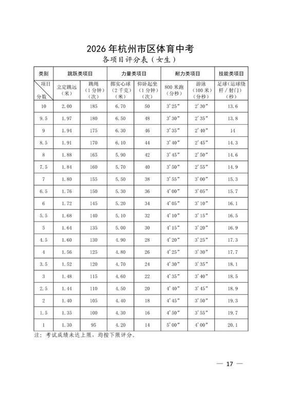 评分标准 考试过程中出现以下情形时,均属无效,不计入成绩: 1.用手或手臂故意触球; 2.球整体出任一侧边线; 3.运球绕杆时撞倒标志杆; 4.漏绕杆后射门。 记者了解到,足球绕杆射门项目已纳入全市中小学体能素质测试多年,学校和学生均较为熟悉,有较好的群众基础。目前其他已将足球纳入体育中考的城市,大部分采用这一形式。 本轮改革,适用于今年应届初三学生。今年采用“必考类与选考类相结合”的方式进行。 必考类即耐力类,耐力类项目在促进学生心肺功能、提高身体素质、锻炼意志品质方面有关键作用,且省内外许多城市都将耐力类项目作为考生必考项。 第一轮报考时,在跳跃类、力量类和今年新增的技能类中,考生可以任选两类。也就是说,考生体育中考依然是考三项,总分30分,每一项10分。第二轮报名时,考生可在第一轮考试中未获满分或未作选择的类别里,按照耐力类必考、其余三类“三选二”原则,选择项目参加考试。 值得一提的是,选考类以考生成绩最高的2个类别计入总分。这也给了考生更大的选择空间。 以下是今年杭州市区中考政策的完整通知。