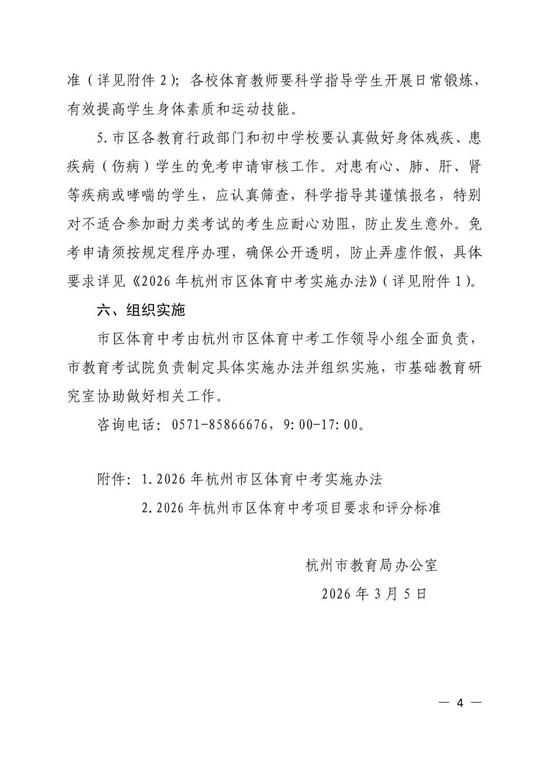 | 3月6日,据杭州市教育局,今年市区体育中考将安排在3月下旬至4月底进行。第一轮考试网上报名时间为3月7日8:00—3月9日18:00。今年市区体育中考最大的变化是新增了足球项目。 在省政府发布的《关于推进足球高质量发展的若干措施》中,明确“将足球列入全省中小学体育课教学内容,纳入中考体育选项范围。”该文件自2026年1月5日起实施。