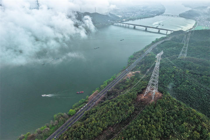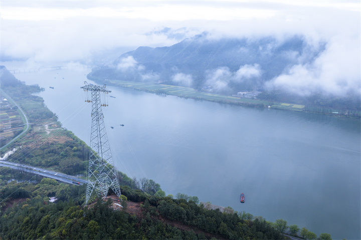 国网杭州供电公司建设部工程管理专职杨正清坦言:“若采用地下工程,不仅面临复杂地质挑战与生态约束,更会大幅增加投资与工期。”因此,架空跨越成为兼顾技术可行、经济合理与生态保护的最优解。 作为该工程浙江段难度最大的作业点,跨越富春江就是要在江面上建设一座无支撑的“能源跨江大桥”。 建设团队负责人国网浙江建设公司业主项目副经理郑力维表示,两岸铁塔间距达到1539米,要把这么长的跨江导线的摆动范围控制在厘米级,难度堪比一场精密外科手术。